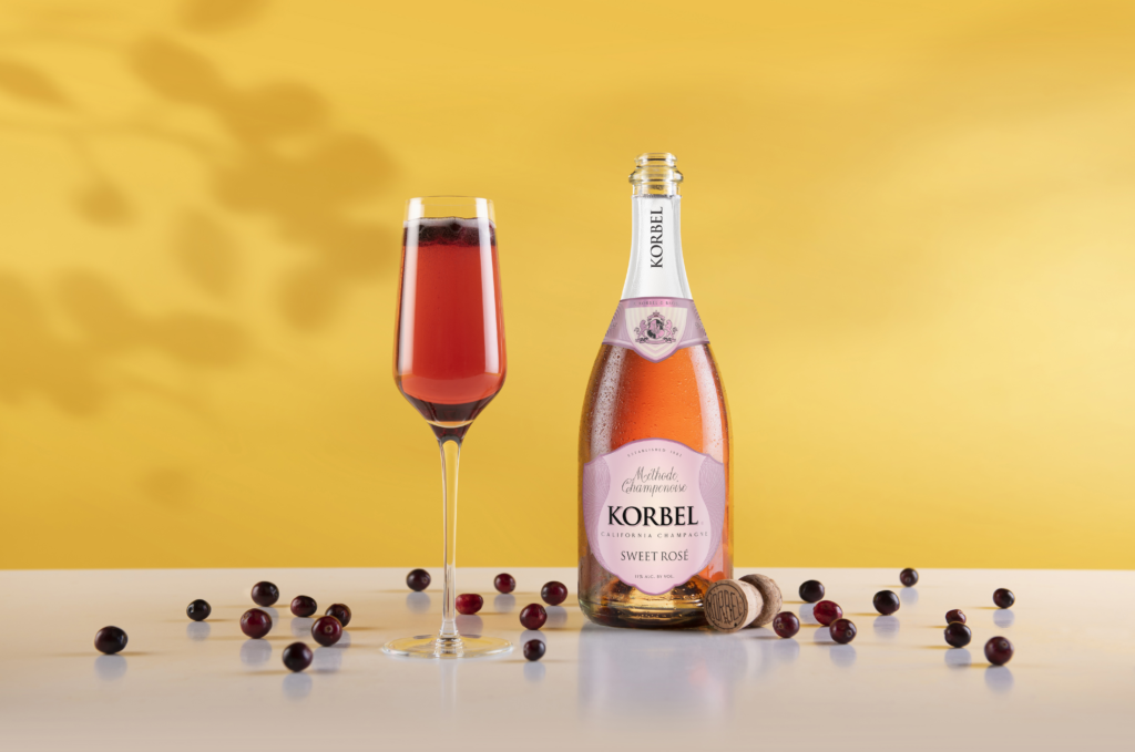 Bubbly, berry, and beyond refreshing, the KORBEL Cranberry Mimosa combines two parts KORBEL Sweet Rosé with one part cranberry juice for a tart twist of tastiness.
